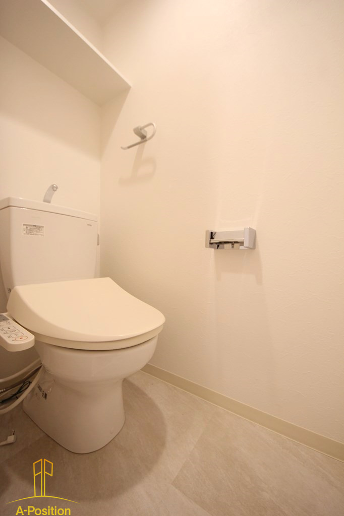 上部には棚が設けられており、トイレットペーパーや掃除用品の収納に便利。