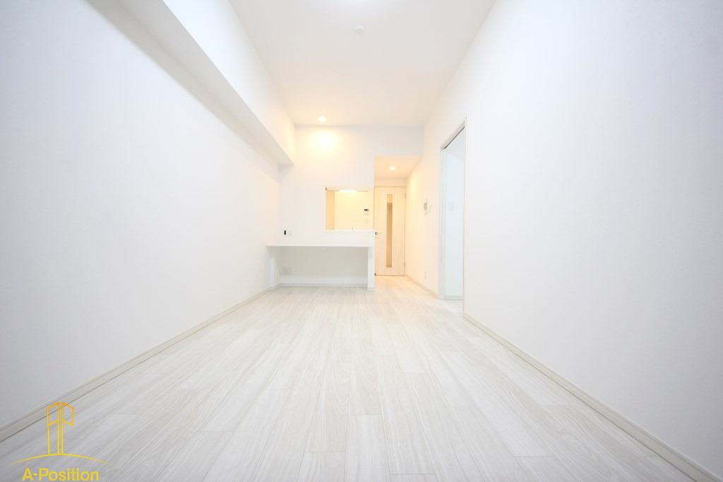 白を基調とした内装と、淡い木目調のフローリングが組み合わさり、実際の帖数以上に広く感じられるLDKです。