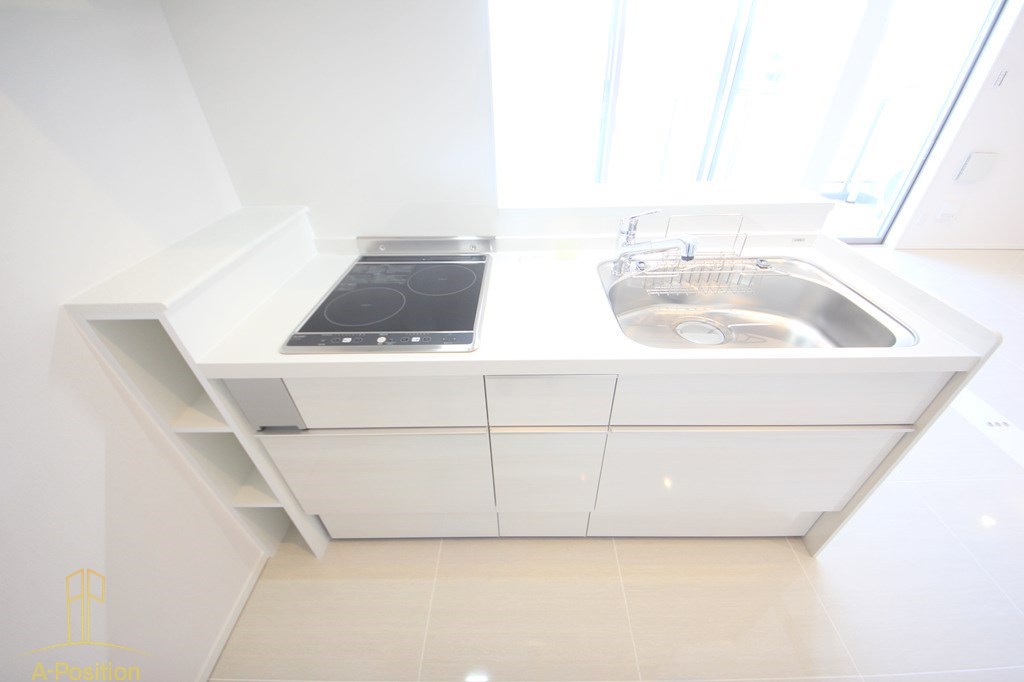 本物件のキッチンは、リビング・ダイニングと一体感のあるカウンタータイプのシステムキッチン。