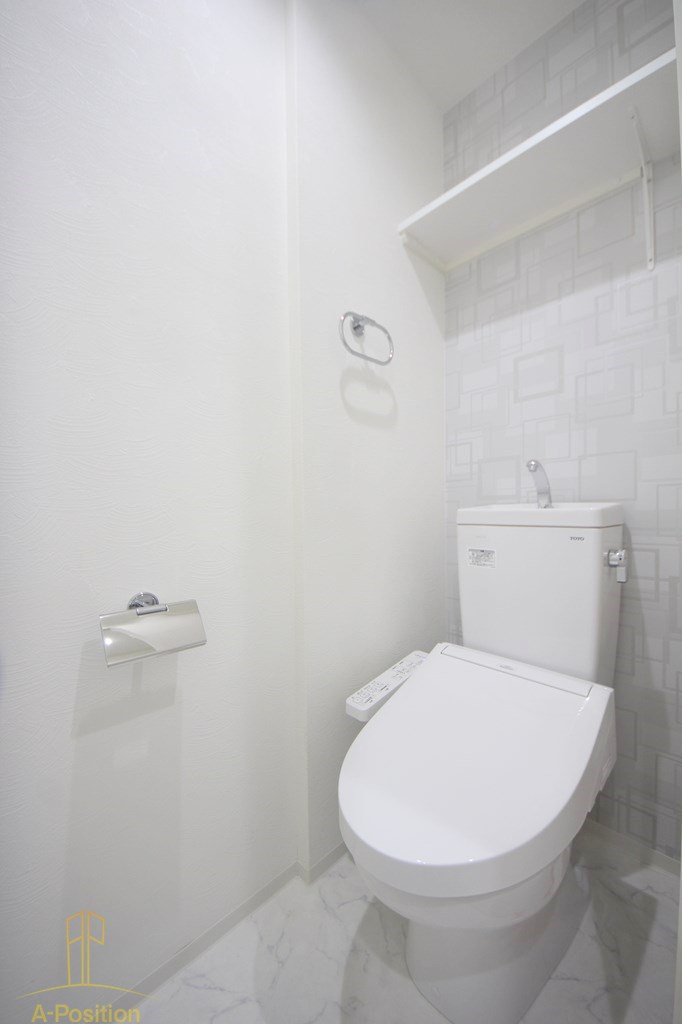 上部には収納棚が設けられており、トイレットペーパーや掃除用品を見せずに収納可能。床材も明るい色味で統一されているため、空間全体がより広く感じられます。