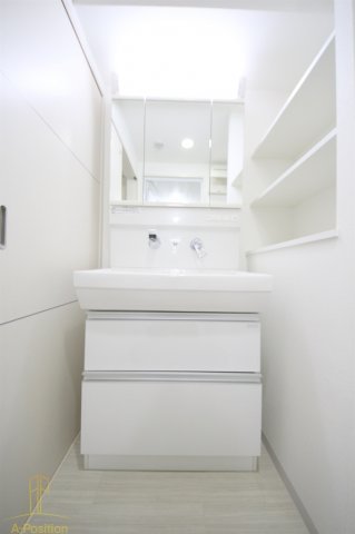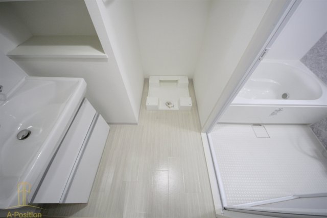 洗面台まわりはシンプルで清潔感のあるデザイン。身支度やスキンケア、ヘアセットといった日常動作がスムーズに行えるよう、無理のない広さが確保されています。朝の慌ただしい時間帯でも圧迫感を感じにくく、落ち着いて準備ができるのは嬉しいポイントです。