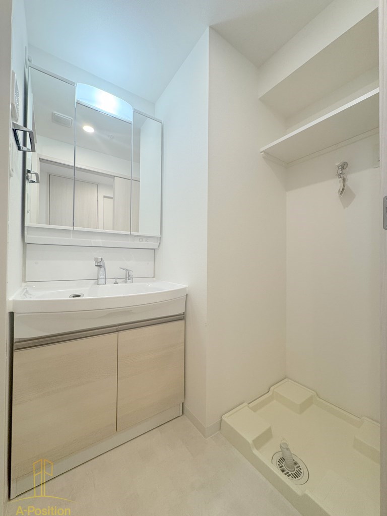 脱衣所は、洗面台・洗濯機置き場がすっきりまとまった機能的なレイアウト。