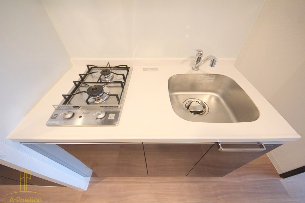 設備面では、2口ガスコンロ付きのシステムキッチンが採用されており、単身用としては十分な調理性能を備えています。自炊をする方でも、同時調理がしやすく、フライパンや鍋を使った料理にも対応できる点が魅力です。調理スペースも適度に確保されているため、簡単な下ごしらえや盛り付けも無理なく行えます。