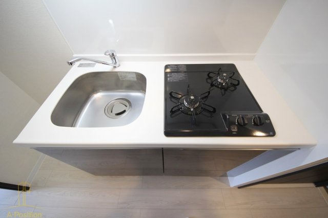 2口ガスコンロを備えているため、同時調理が可能で、忙しい平日でも効率よく料理ができます。ワークトップは清潔感のあるカラーで、空間全体を明るく見せてくれるのもポイントです。