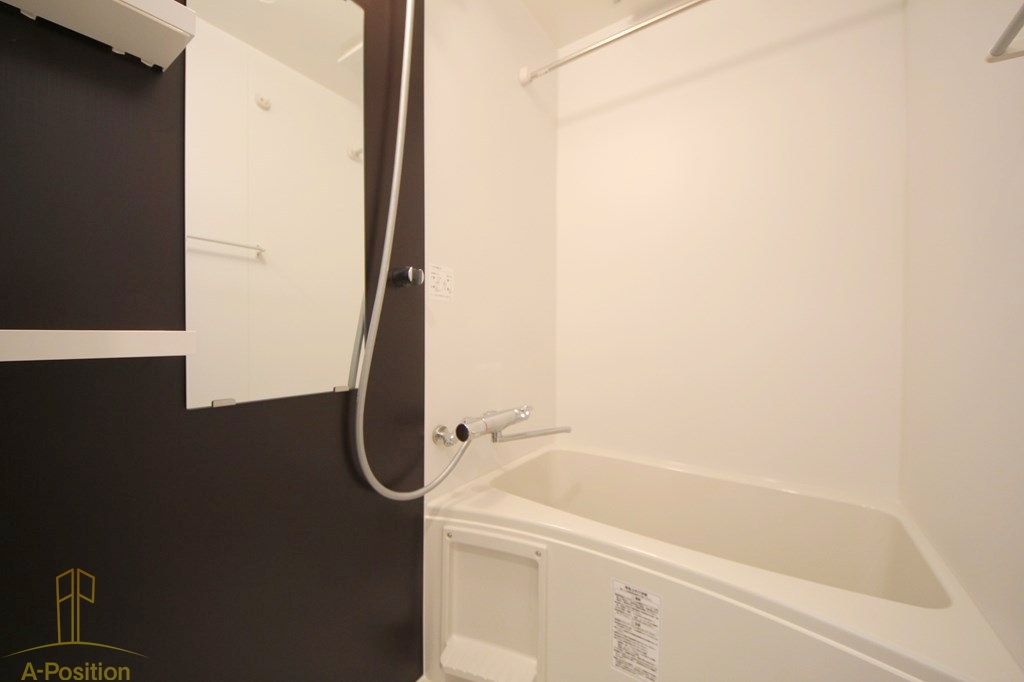収納棚やミラーも備え付けられているため、シャンプー類やバス用品をすっきりと整理可能。無駄のないレイアウトで、限られたスペースを有効活用しています。