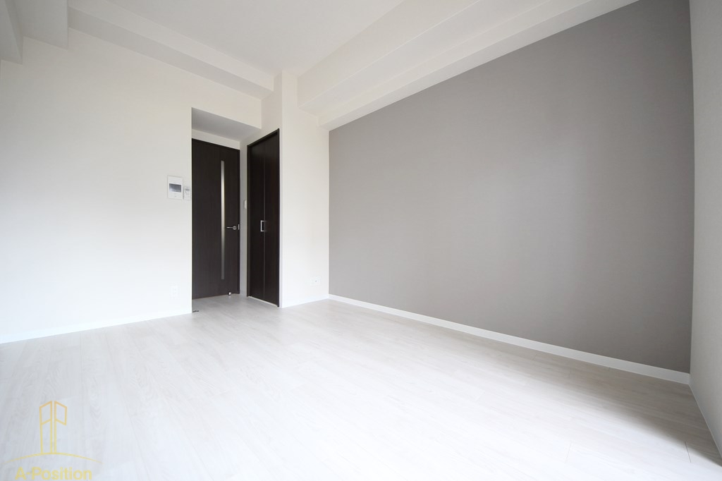 落ち着いた色合いでまとめられた洋室は、約7帖の広さを確保しており、一人暮らしにはゆとりのある空間設計となっています。アクセントクロスが室内に程よいメリハリを与え、シンプルながらも洗練された印象です。
