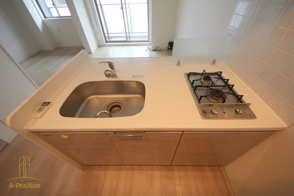 白を基調とした清潔感のあるシステムキッチンは、空間にすっと馴染むシンプルで洗練されたデザイン。2口ガスコンロを備えており、自炊派の方にも十分な調理スペースを確保しています。シンクとコンロの間には作業スペースがあり、下ごしらえから盛り付けまでスムーズな動線が魅力。対面カウンター仕様のため、リビングを見渡しながら料理ができ、開放感も良好です。収納も上下にしっかり備わっており、キッチン周りをすっきり保てる実用性の高い仕様となっています。