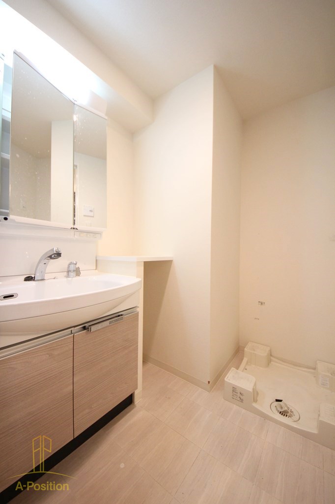 白を基調とした明るく清潔感のある脱衣所には、収納付きの独立洗面台を設置。ミラーキャビネット仕様のため、洗面用具や日用品をすっきりと収納できます。洗面台横には洗濯機置場が確保されており、家事動線もスムーズ。カウンター下や壁面にも余白があり、ラックなどを置けば収納力をさらに高めることも可能です。バスルームと分かれた独立空間のため、来客時でも気兼ねなく使える点も嬉しいポイント。毎日の身支度が快適になる、実用性の高い脱衣スペースです。