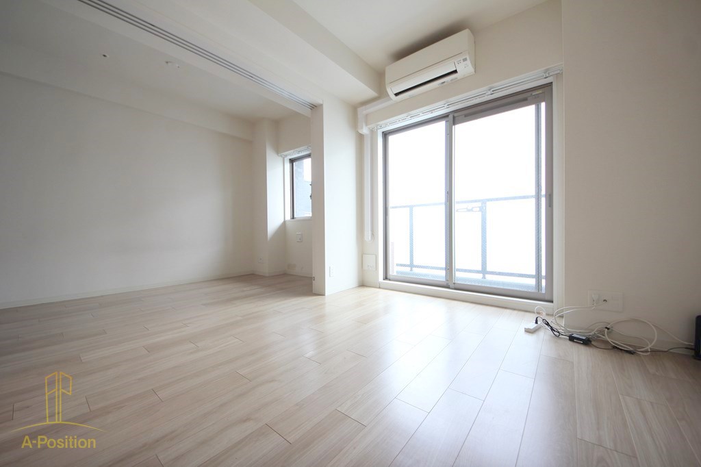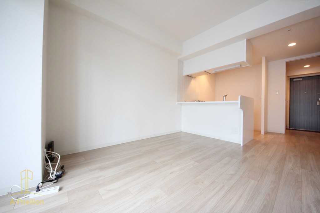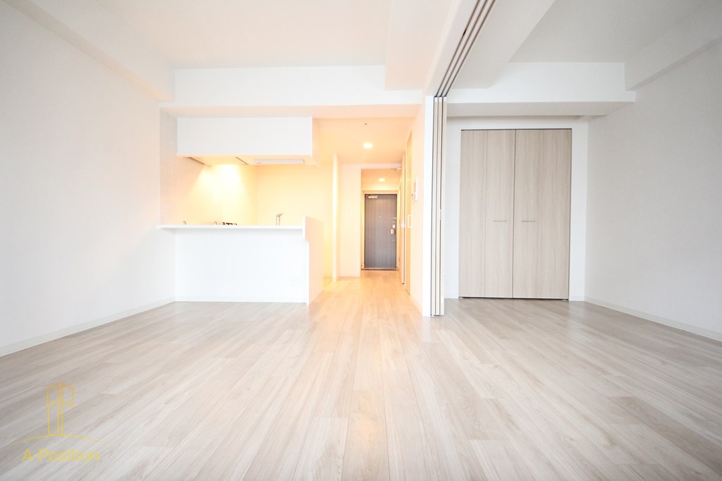 明るい色味のフローリングが印象的なLDKは、約10帖のゆとりある空間。白を基調とした内装のため、実際の広さ以上に開放感を感じていただけます。対面式のカウンターキッチンはリビング全体を見渡せる配置で、お料理中も空間との一体感を損ないません。洋室とはスライドドアで仕切られており、開ければワンルームのような広々とした使い方も可能。ライフスタイルに合わせて柔軟にレイアウトを変えられる、非常に使い勝手の良いリビングです。